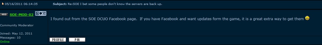 It also suggests that RadarX’s comments about how they used multiple channels to tell players the servers were back up could have possibly completely missed SOE employees.