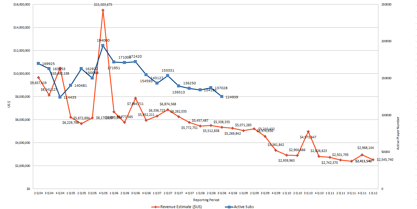 There are a number of reasons why CoH/V saw that dip in Q1 2012 – Star Wars: The Old Republic may have eaten into the paying player base, or perhaps what was offered in the Paragon Markets wasn’t enough to bring in the dollars for that quarter, or perhaps Paragon Studios didn’t get the F2P model right – but either way the F2P bounce appears to have been pretty limited for CoH/V.