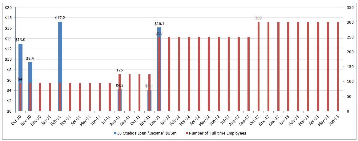 Pretty simple – in October 2010 38 Studios got US$13m up front from the deal to move to Rhode Island, and then another US$9m for announcing when it is making the move. You can see how FTE employee numbers ramp up over time. One key thing to note is that US$16.1m in December 2011 has two parts – a US$3.1m payment for having over 250 FTEs and a US$13m payment for meeting all previous milestones.