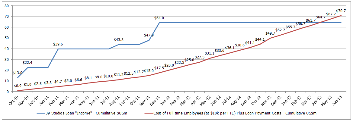 Suddenly the loan “income” is all gone by the end of 2012. The cost of operating a huge studio – and a huge studio that was created in order to get the US$75m loan with incentives paid to keep the studio growing – has consumed US$50m in roughly two years.
