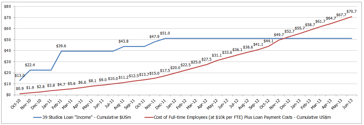 Next, let’s look at the cumulative impacts of these figures – the cumulative amount paid to 38 Studios and the cumulative cost of having that many FTEs (assuming the cost of $10k per employee per month as discussed in my previous article) plus loan repayments (roughly $560k in May 2011, the US$1.125m in May 2012 that sparked all this interest and a planned US$2.6m due in November 2012).
