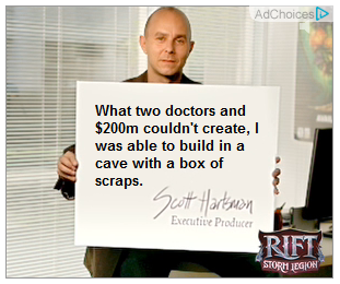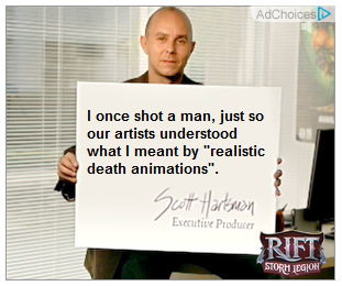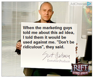 I like the new Rift ad for Storm Legion. No, not the one with the woman in the chainmail bikini, but the one where Rift’s Exective Product Scott Hartsman flips around a card that answers a player’s question.