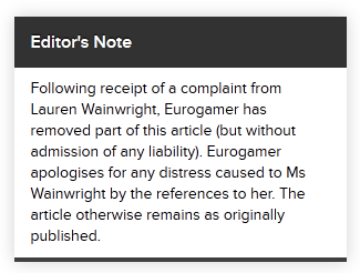 UPDATE 20 November 2012: Wainwright indicates that she didn’t talk to any lawyers before having a “short communication” with Eurogamer, but suggested that the comments could be considered libellous. Her view is that Eurogamer then spoke to their legal representatives who suggested they remove names from the article – both hers and Cook’s. Wainwright says she regrets her actions – they happened because she started to get abuse once the article had gone up and wanted it to stop.