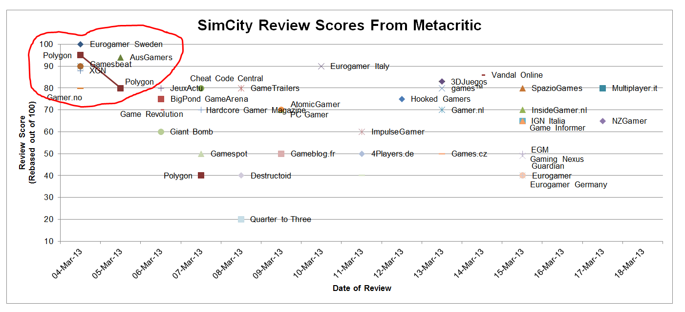 It’s pretty clear that the day 1 and day 2 reviews from gaming press sites were much, much more positive than any site that reviewed it later on. They cluster up in the 80% to 100% range, but even a few days later the review scores are much more spread. Polygon has three review scores up there to reflect the changing review scores it gave SimCity – a gushing March 4 review gave the title 9.5, a day later that was revised to 8.0 and then on March 7 it was downgraded again to 4.0.