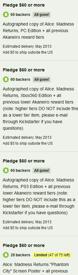 He used Kickstarter like a store. ‘Kicklaunching‘ was the term American McGee used, saying that having a Kickstarter on a 99% finished game gave the title “a real boost to awareness and engagement”. The Kickstarter rewards offered a lot of in-game items, but they also merchandise and titles that the studio already had available. Look through the reward levels – a rough count comes up with 39 different backer reward options – and look at what was on offer. Here’s a brief screenshot that shows off some of this: