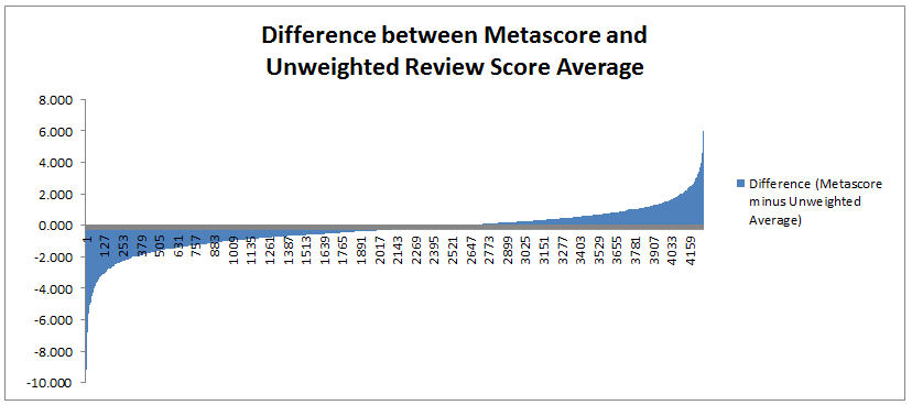 Overall Metacritic’s metascore doesn’t differ much from an unweighted average. And if it does differ, it tends to skew slightly negative.