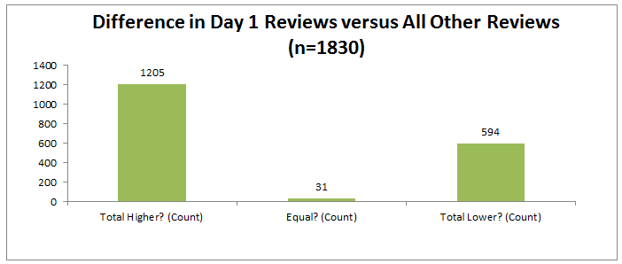 So, are Day 1 review scores positively biased, returning higher scores than reviews that come later? It certainly looks that way.