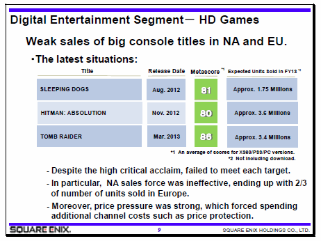 From Square Enix’s briefing notes – their Metacritic-based forecast indicated that Sleeping Dogs would sell roughly 2m – 2.5m units, Hitman: Absolution would sell 4.5m – 5m units and Tomb Raider would sell 5m – 6m units worldwide. One of their key points is that the US market didn’t behave as expected in purchasing these titles.