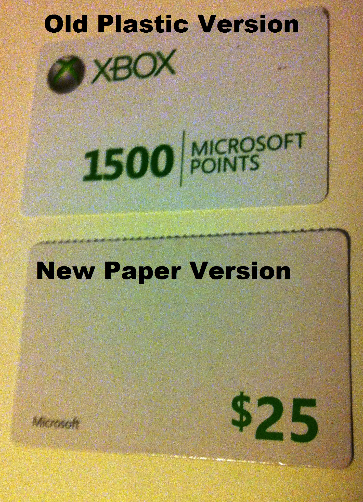 At some point Microsoft switched the material they print Xbox Live value cards on. For a long time it was a hard plastic card, but along with the switch from Microsoft Points to local currency has come a switch to a hard cardboard card. Here they are, side by side: