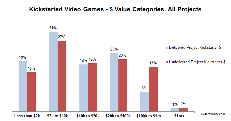 Also, the reason < $20k seem to have a higher delivery rate could be that most of the big ones were post Double Fine Adventure, and being big, they take longer than a year and a half to finish.