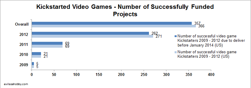 Overall were 366 successfully Kickstarted video game projects from 2009 to 2012 inclusive, with 357 of them promising to deliver something by December 2013 in their Kickstarter pitch. (Image sourced from: I created it)