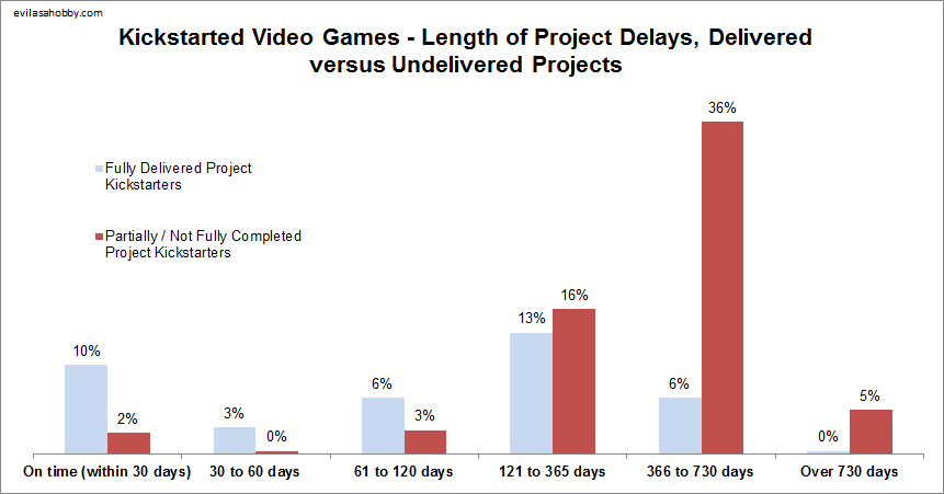 The major finding of this analysis was that only around a third of successfully funded Kickstarter video games have fully delivered on their title over the indicated time period. If you include the number of partially delivered titles, such as the first episode of five being released or an iOS version being released with a PC version still on the way, this delivery result increases to about half of all Kickstarted video games.