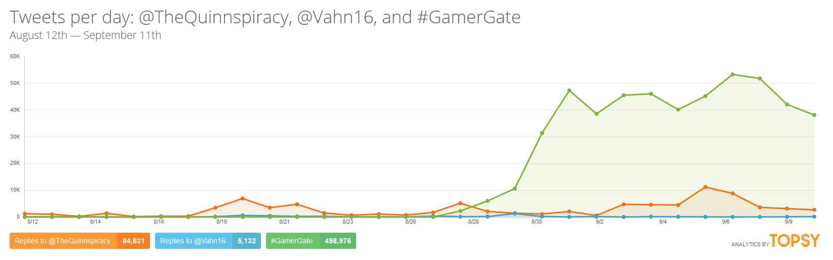 Like a number of people who pay attention to video games culture, I’ve been watching the whole awful GamerGate versus Zoe Quinn thing roll onwards with a growing sense of nausea. I’ve been looking for something to cover that hasn’t been addressed elsewhere already. In short, let’s look at how things trended using Google Trends (for search terms) and Topsy (for Twitter).