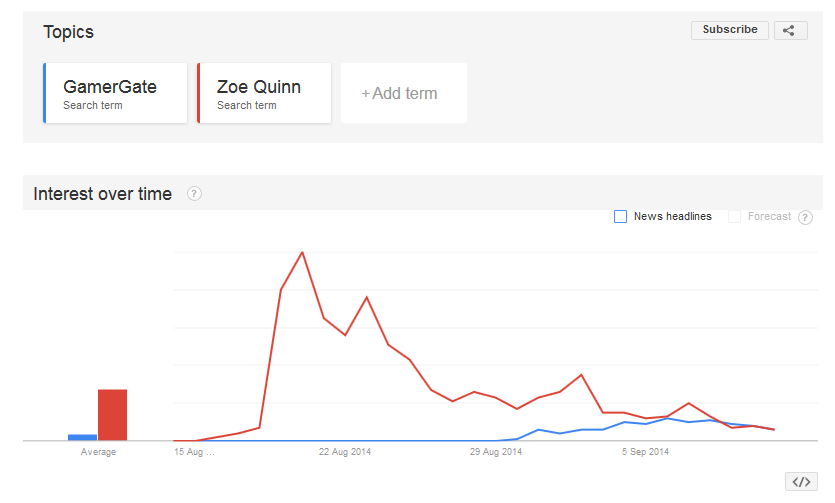 In Google, searches for “Zoe Quinn” have overall exceeded searches for “GamerGate”, which sort of points where the interest really lies (one way or the other). Maybe GamerGate needs more naked pics. (Image sourced from: Google Trends)