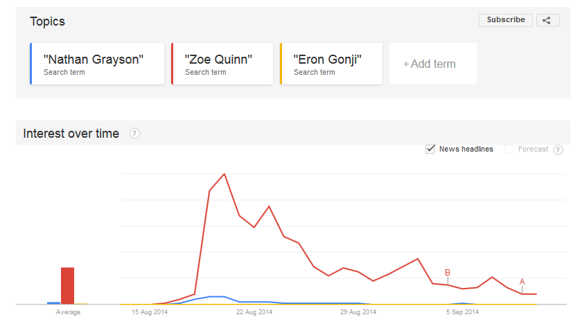 Nope. Searching for Zoe Quinn was by far a bigger trend compared to anyone else mentioned in this debacle. (Image sourced from: Google Trends)